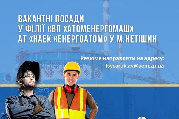 Філія «ВП «Атоменергомаш» АТ «НАЕК «Енергоатом» у м. Нетішин оголошує набір працівників за такими професіями: