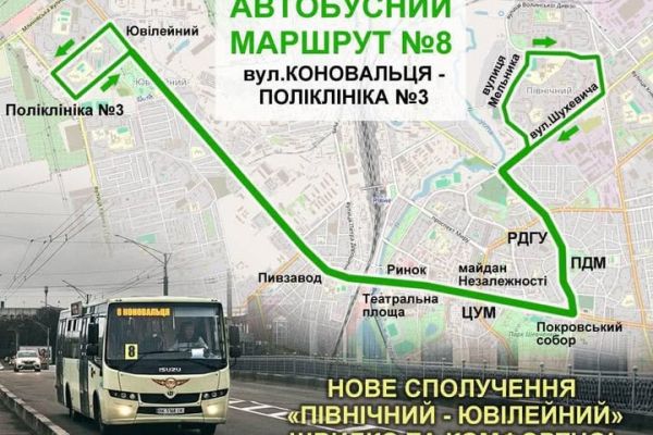 З метою вдосконалення пасажирських перевезень у Рівному у середу, 26 лютого, запустять новий комунальний автобусний маршрут №8 «вул. Євгена Коновальця – Поліклініка №3».
