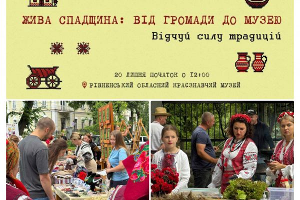 Вишивка, лозоплетіння, бісероплетіння, ляльки-мотанки, вироби з ротангу, кераміка, в’язані іграшки, традиційні страви та багато іншого — вже цієї неділі, 20 липня, на подвір’ї Рівненського обласного краєзнавчого музею можна буде побачити, скуштувати й відчути культурну спадщину нашого краю.
