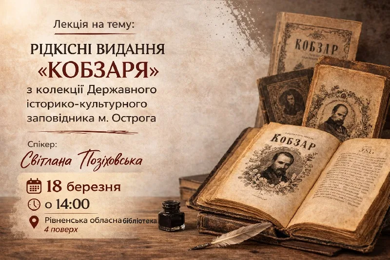 Рівненська обласна універсальна наукова бібліотека запрошує 18 березня о 14:00 на лекцію «Рідкісні видання “Кобзаря” з колекції Державний історико-культурного заповідника м. Острога», під час якої буде представлено рідкісні видання знаменитої книги Тараса Шевченка — «Кобзаря», що зберігаються у фондах Державного історико-культурного заповідника м. Острога.Під час зустрічі ви зможете дізнатися про історію видання «Кобзаря», особливості окремих рідкісних примірників, їхню художню та історичну цінність.